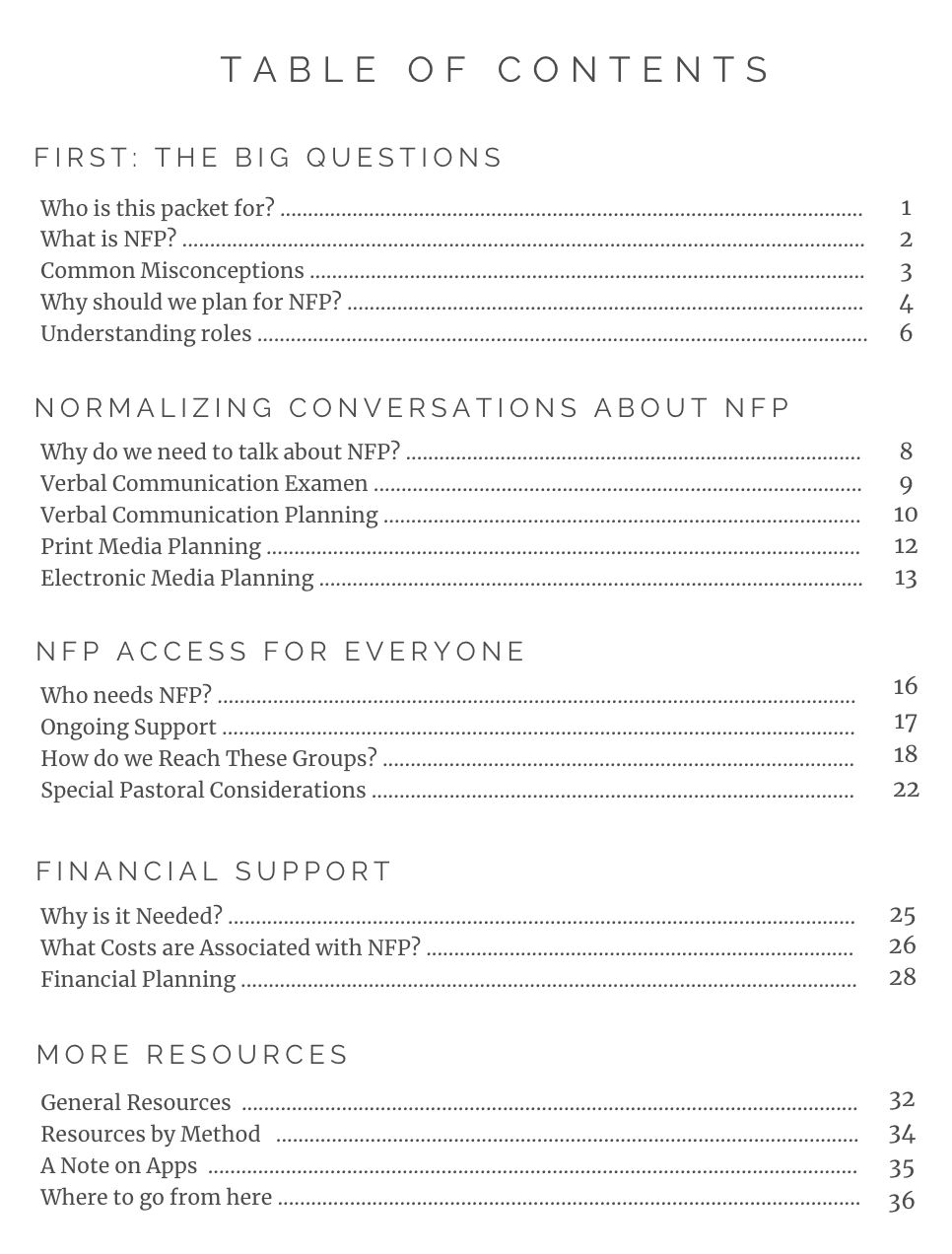 If you wish to promote NFP in your parish but do not know where to start, this packet is for you. It addresses a variety of people affected by NFP, shows how to counsel couples, and offers excellent links for NFP resources. It will help pastors and pastoral councils promote the beauty of the Church’s teaching on fertility.